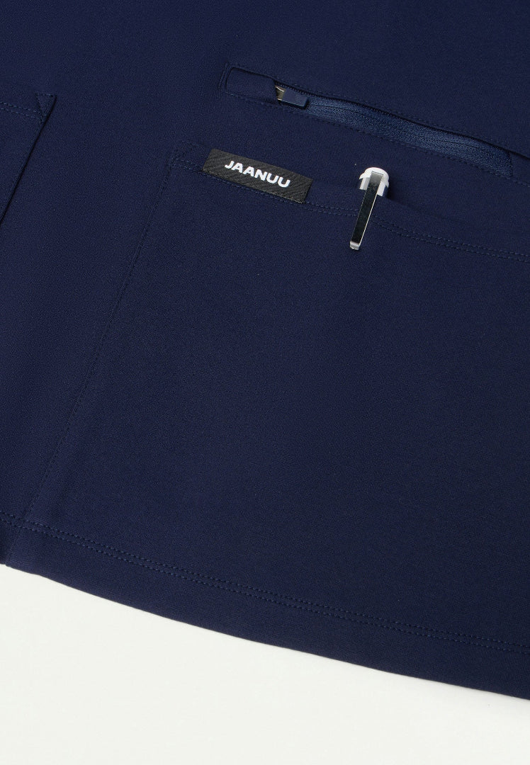 La blusa médica JAANUU Kass Slim de 4 bolsillos UltraSOFT para mujer, en el distinguido azul marino medianoche, ofrece una autoridad atemporal con un ajuste escultural que crea una silueta elegante y ofrece una funcionalidad inigualable para los profesionales de la salud. Esta refinada blusa médica está confeccionada con tejido UltraSOFT™ de primera calidad que proporciona una comodidad excepcional, manteniendo los estándares profesionales esenciales en entornos médicos.