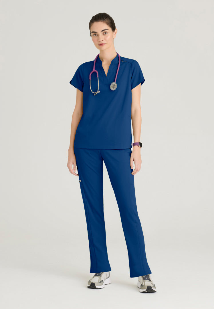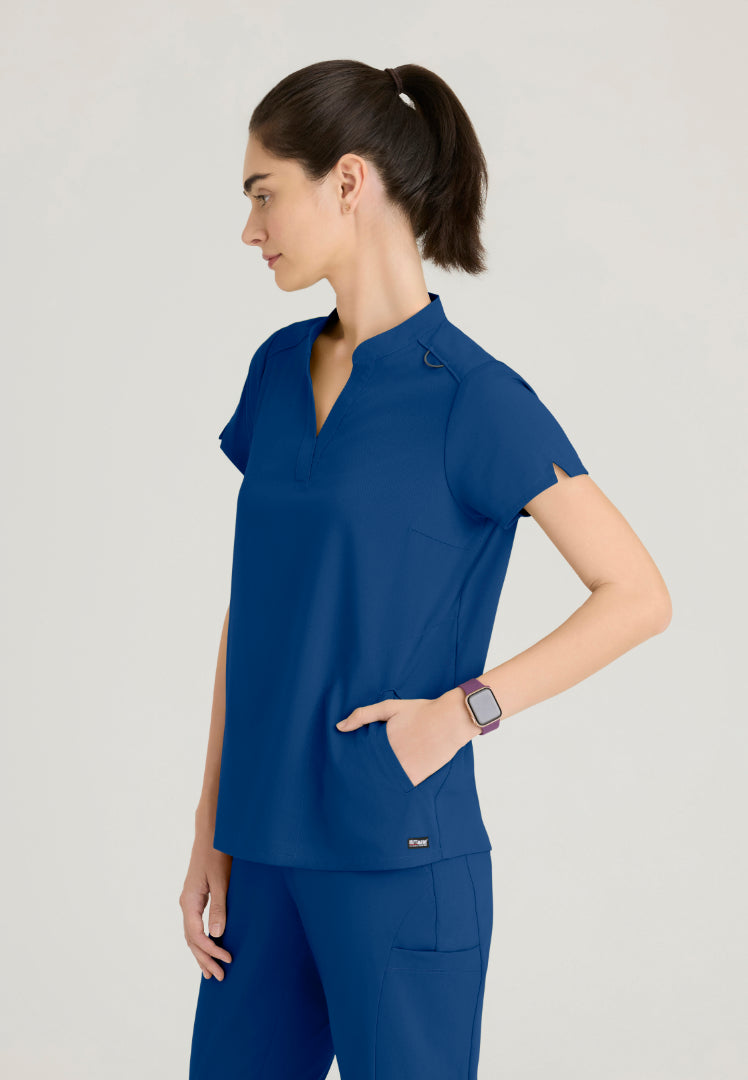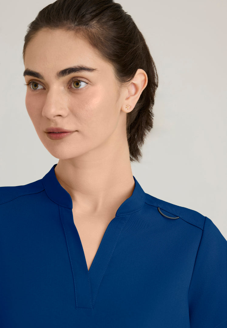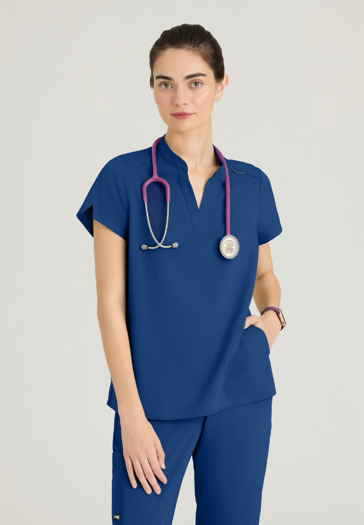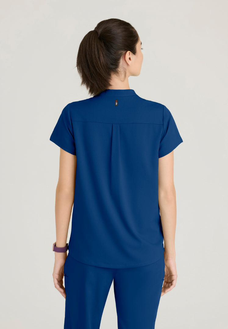 The Avery 2-pocket top in Galaxy features a banded collar, notched sleeves, two angled waist pockets and a back yoke provides an understated yet refined look. Crafted from a luxurious blend of polyester, rayon, and spandex, it offers superior comfort and ease of movement. Includes Moisture-wicking and soil-release technology.