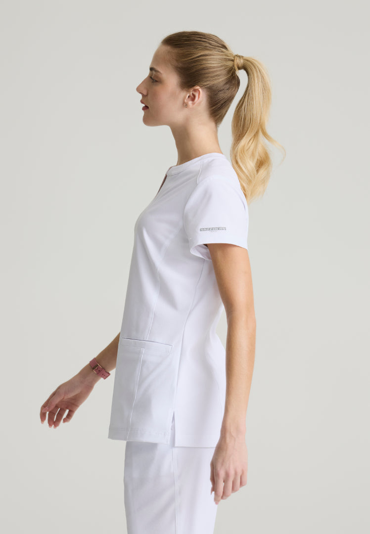 Featuring a stylish banded collar with V-placket, the Coast Top in White is designed for both comfort and function. With two welt waist pockets and a handy badge loop, you’ll have all your essentials close at hand. The flattering princess seams create a sleek silhouette, while the straight hem and side seam slits provide freedom of movement. Crafted from eco-friendly, 4-way stretch fabric that wicks moisture, you'll stay cool and comfortable. Plus, it’s made with recycled bottles, making it a sustainable choice for your wardrobe!
