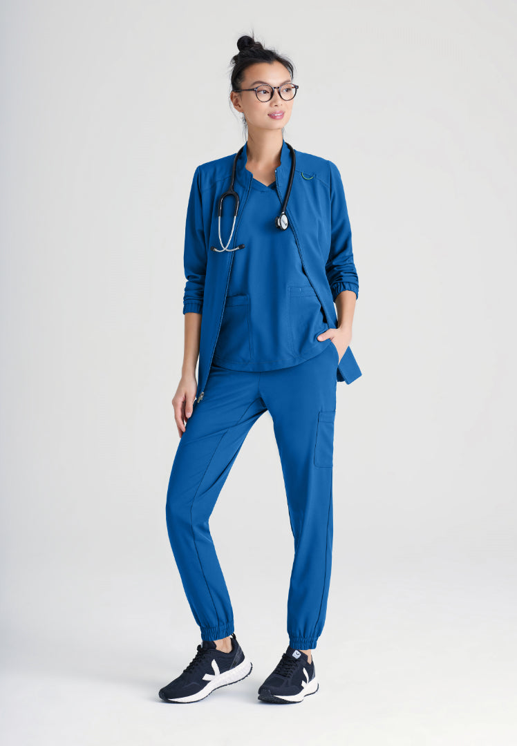 The Grey's Anatomy Evolve Virtue warm-up jacket in New Royal is designed to deliver warmth, professionalism, and confidence in any clinical environment. Crafted with lightweight, 4-way stretch fabric and featuring a full zip front, this jacket layers seamlessly over your scrubs without restricting movement.